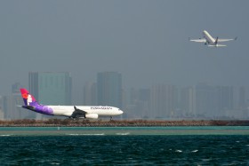 Hawaiian pojíždí k ostrovní dráze ("Reef Runway"), z níž právě odlétá Delta. V pozadí centrum Honolulu.