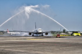 První přistání B767 American Airlines. Zahájení nové linky mezi Filadelfií a Prahou.